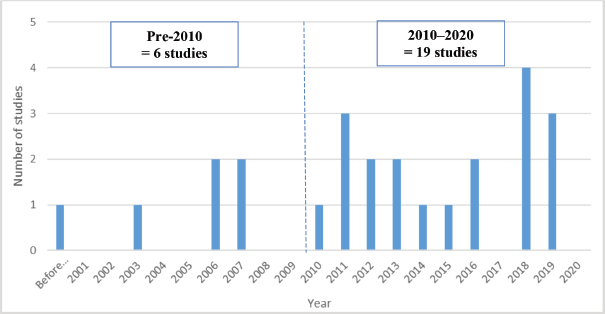 With only 25 articles identified, there is a clear paucity of published literature on educational initiatives in the field of oncology. This may be due to an absence of studies investigating this topic, or these initiatives are not being widely published in the peer-reviewed medical literature. For example, in LMICs, the emphasis may be on implementing an educational programme, and due to time, financial and/or language constraints, publication of such work, at least in full-text format, may not be possible. Over time, we found a gradual increase in the number of published manuscripts, with only six articles published before 2010 compared to 19 between 2010 and 2020 (Figure 3). This increase is encouraging as publication allows others to learn important lessons for design and implementation of medical education initiatives in oncology in LMICs. Where possible, efforts to assist educators in overcoming obstacles to conducting and publishing studies related to their initiatives could be considered. On the other hand, less onerous methods of disseminating important findings should also be encouraged.