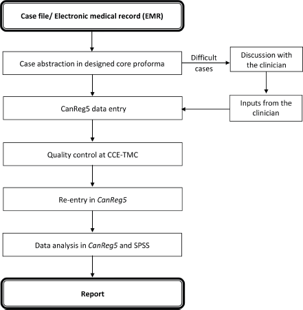 The primary site and histology are coded using the International Classification of Diseases for Oncology 3rd edition (ICD-O3) [10]. The data of abstracted cancer cases are regularly entered in the CanReg5 software [11]. This entered data is checked by the senior staff from CCE-TMC for quality control. Any error observed in the case abstraction is discussed with the clinician and registry staff. Moreover, for the accuracy of the data, CCE-TMC staff randomly checked the data through the TMC server and senior staff visited Sangrur to discuss the errors with concerned staff and made sure that the errors were corrected and re-entered carefully into the database. The final data entered is analysed using the CanReg5 software and SPSS software version 21.0 (IBM, Armonk, New York, USA). The cancer registration method is shown in Figure 2.