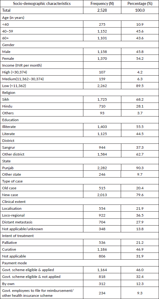 In the year 2018, we have registered 2,969 cases. After excluding benign, in situ, uncertain behaviour cases, the study sample contains 2,528 cases; out of which 1,362 (53.9%) completed the treatment and 1,166 (46.1%) did not. As per socio-demographic data, the majority of the cases are females (54%), around 90% of the total patients are from low income category, most patients are from Sikh community, approximately 56% of patients are illiterate, more than 60% stay out of Sangrur district and around 80% cases are new cases. The detailed socio-demographic characteristics of the cancer patients have been described in Table 1.