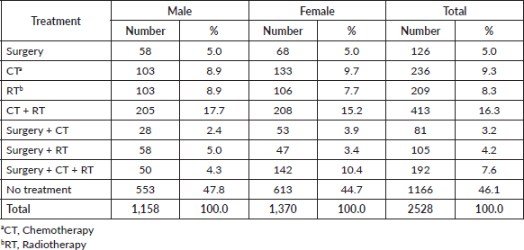 Out of 2,528 cancer cases, 1,362 (53.9%) completed the treatment. Among these 1,362 cases, 126 (5.0%) underwent surgery, 236 (9.3%) CT, 209 (8.3%) RT, 413 (16.3%) RT and CT, 81 (3.2%) surgery and CT, 105 (4.2%) surgery, RT and 192 (7.6%) underwent surgery, RT and CT. The treatment details are presented in Table 2. The univariate and multivariate analysis is presented in Table 3. In the univariate analysis, age, clinical extent of disease, education, district, type of case (old/new), the intention of treatment and payment mode are statistically significant and the gender, income, religion and state are not significant.
