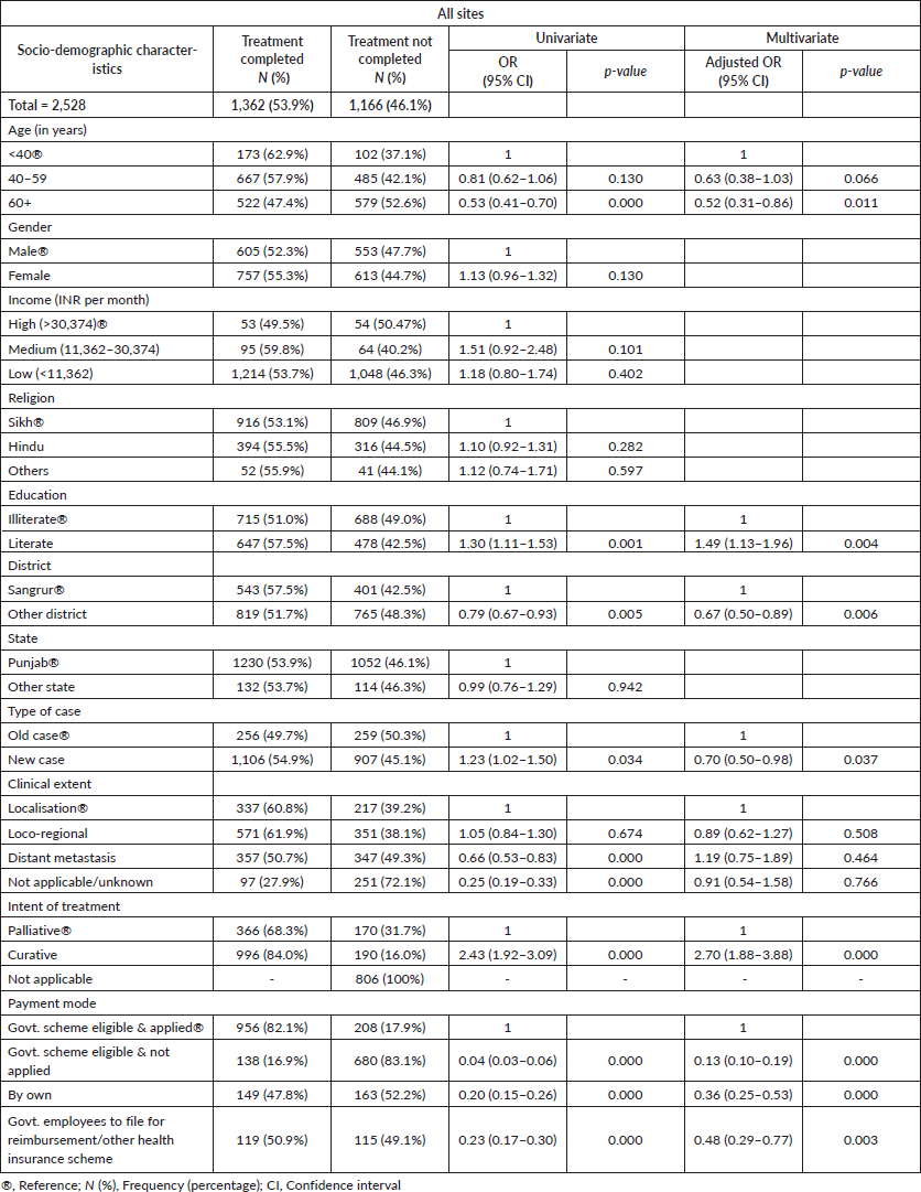 The important findings of this study are that young patients, educated (literate), distance from the hospital staying in Sangrur district (i.e. near to the treating hospital), those who received curative treatment and those who have applied for the government health schemes for financial support have impact on treatment completion. The other variables like the clinical extent of the disease, religion, gender and income have not shown any effect on the treatment completion. This study highlights the social determinants of treatment compliance that has significant effect on outcome of cancer treatment.