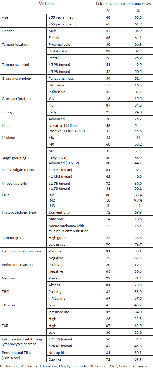 This study included 103 colorectal adenocarcinoma carcinoma cases; their characteristics were demonstrated in Table 1.