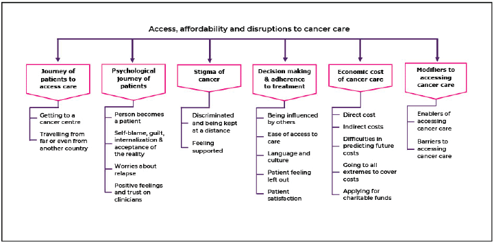 Results: Cancer patients (n = 100) and their caregivers (n = 48) were interviewed for the study. The six themes that emerged were related to a) the journey of patients to access care, b) the psychological journey of patients, c) stigma of cancer patients, d) decision-making and adherence to treatment, e) economic costs of cancer care and its impact and f) modifiers to accessing cancer care.