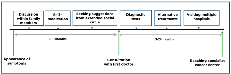 On the other hand, lack of awareness, misinformation, lack of trust in medical establishments, having to travel far to access care, lack of involvement of the patient in treatment-related decision-making and financial hardships to support the direct and indirect costs of cancer care often contributed to the delays in getting treated for cancer. The enablers and barriers are described in Table 2. The patient interviews also reflected some of the time intervals of their cancer journey. The two intervals: a) from onset of symptoms to undergoing medical evaluations and b) onset of symptoms to reaching a specialist cancer centre are schematically represented in Figure 2. Following the initial symptoms, the patients often discussed their problems with their immediate family members and then within their extended social network. Some patients tried self-medication. In the present study only, 11% of patients accessed alternative forms of care as homoeopathy, Ayurveda and other indigenous systems of medicine. Our interviews elicited that the time interval between the onset of symptoms and first consultation ranged from 1 to 9 months. The next steps of diagnostic assessment and seeking multiple consultations in various hospitals often extended between 3 and 24 months before the patient finally reached a specialist cancer hospital for treatment. In this study, along with the qualitative information, a certain amount of quantitative data is derived from the interviews on the delay to reach a cancer centre and the reasons for the delay and this data has aided in reaching methodological triangulation [27].