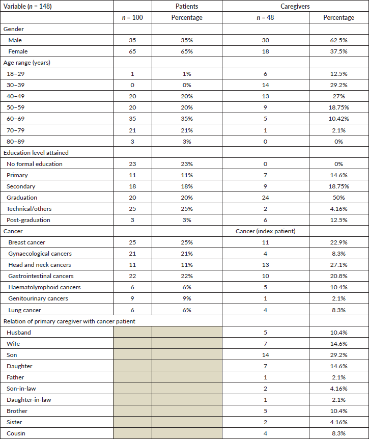 The study included 148 participants comprising 100 patients with cancer and 48 caregivers of cancer patients. Data collection continued for patients and care givers as per the criteria of meeting data saturation as is conventional in qualitative research. The mean age of patients and caregivers recruited for the study was 61.3 years (range: 25–89) and 44.2 years (range: 21–75), respectively. As evident from Table 1, younger patients were often accompanied by older caregivers as their parents or elder siblings and older patients were accompanied by their younger caregivers as their children. Family members (husband, wife, sons and daughters) constituted 69% (33/48) of the caregivers interviewed. Around half (48%) of the patients had graduate-level qualifications and a quarter (25%) had no formal education and thus the sample of patients represented a wide spectrum in their respective socio-economic and educational backgrounds. Men constituted 35% (35/100) of the patients recruited to the study and 62% of care givers (30/48). Thirteen percent of the patients (20/148, 13.51%) recruited for the study had financial support from government or private donor funds to support the cost of cancer treatment. All the common cancers in India (breast cancer, head and neck cancers, gynaecological cancers, lung cancer and others) were represented in this study (Table 1). Proportional number of various types of cancer patients was recruited based on the approximate proportion of cancer patients reported by GLOBOCAN [1].
