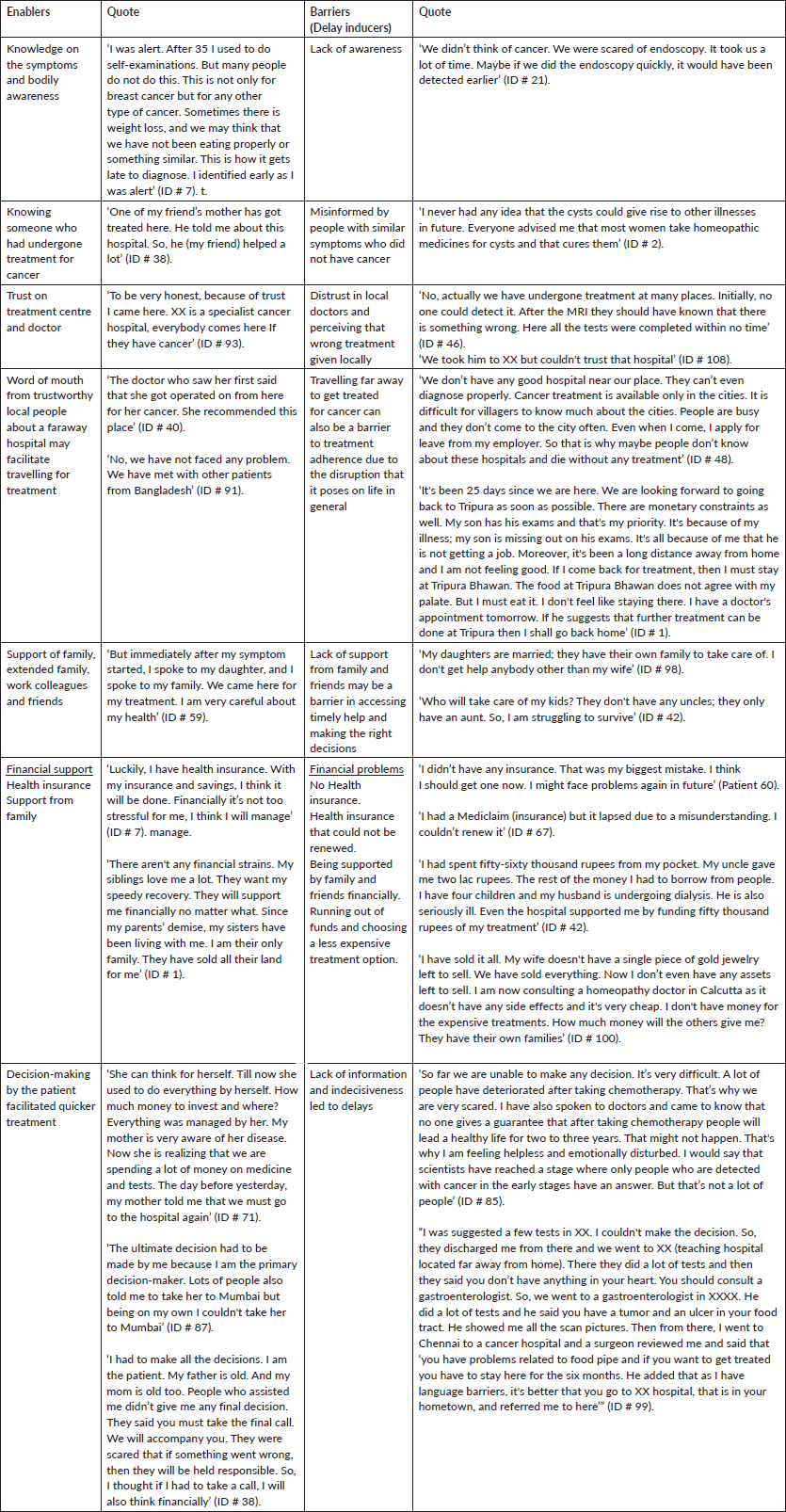 The interviews highlighted several enablers to accessing cancer care in India (Table 2). Bodily awareness, knowing others who had been treated for cancer, having trust in the medical system, support from family members, being involved in treatment-related decision-making helped patients to access care. Having the financial means to fund treatment was also an important enabler to access care.