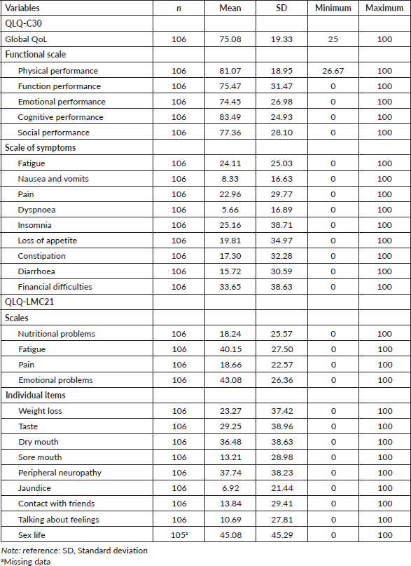 The values of the descriptive analysis of the scores of QLQ-C30 and QLQ-LMC21 were converted into a scale from 0 to 100, and summarised in mean, minimum, maximum and standard deviation (SD). The results were considered significant for p-values below 0.05.