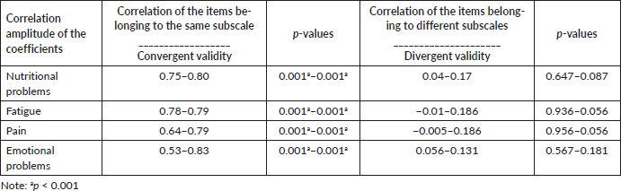 Evidence for discriminant validity is provided when measures of constructs that theoretically should not be highly related to each other are, in fact, not found to be related to each other [24]. In this study, to assess the divergent validity, the correlations between the items of different subscales were analysed, that is, the correlation between items constituting subscales that have the function of measuring different domains. For example, the correlation of the score of item ‘31. Have you had trouble with eating?’ (which is part of the ‘nutritional problems’ scale) with the total score of the ‘fatigue’ subscale.