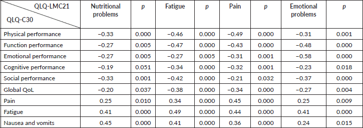Table 3. Spearman’s correlation coefficient between the QLQ-C30 and QLQ-LMC21 scales (n = 106).