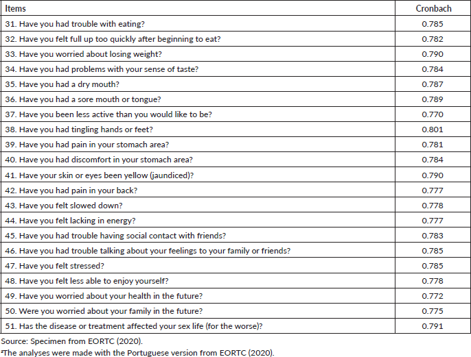 When assessing the internal consistency by excluding each item from the questionnaire (Table 4), it was possible to observe that the Cronbach’s alpha increases to 0.801 with the exclusion of the ‘Have you had numbness (tingling) in your hands or feet?’ item. In addition, it rises to 0.791 when excluding the ‘Did your disease or treatment affect your sex life (for the worse)?’ item. These results demonstrate that the exclusion of any item does not significantly alter the general internal consistency of the questionnaire. Thus, there was no need to modify or exclude any item from the questionnaire.