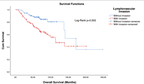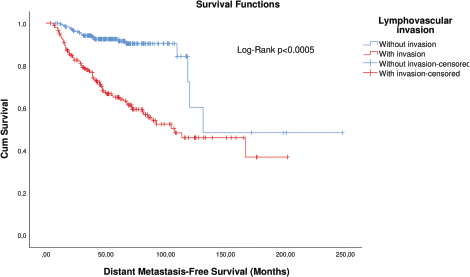 KM curve analysis showed proportionality of risks for both OS (Figure 1) and distant metastasis-free survival (DMFS) (Figure 2). By univariate Cox regression, lymphovascular invasion was observed as a prognosis factor for both OS (HR: 4.026 (2.608–6.781), p < 0.0005) and DMFS (HR: 3.083 (1.947–4.883), p = 0.006). Correction by other covariables (multivariate Cox regression) showed that lymphovascular invasion as an independent prognostic factor for both OS (HR: 2.045 (1.226–3.409), p = 0.006) and DMFS (HR: 2.373 (1.404–4.010), p = 0.001).
