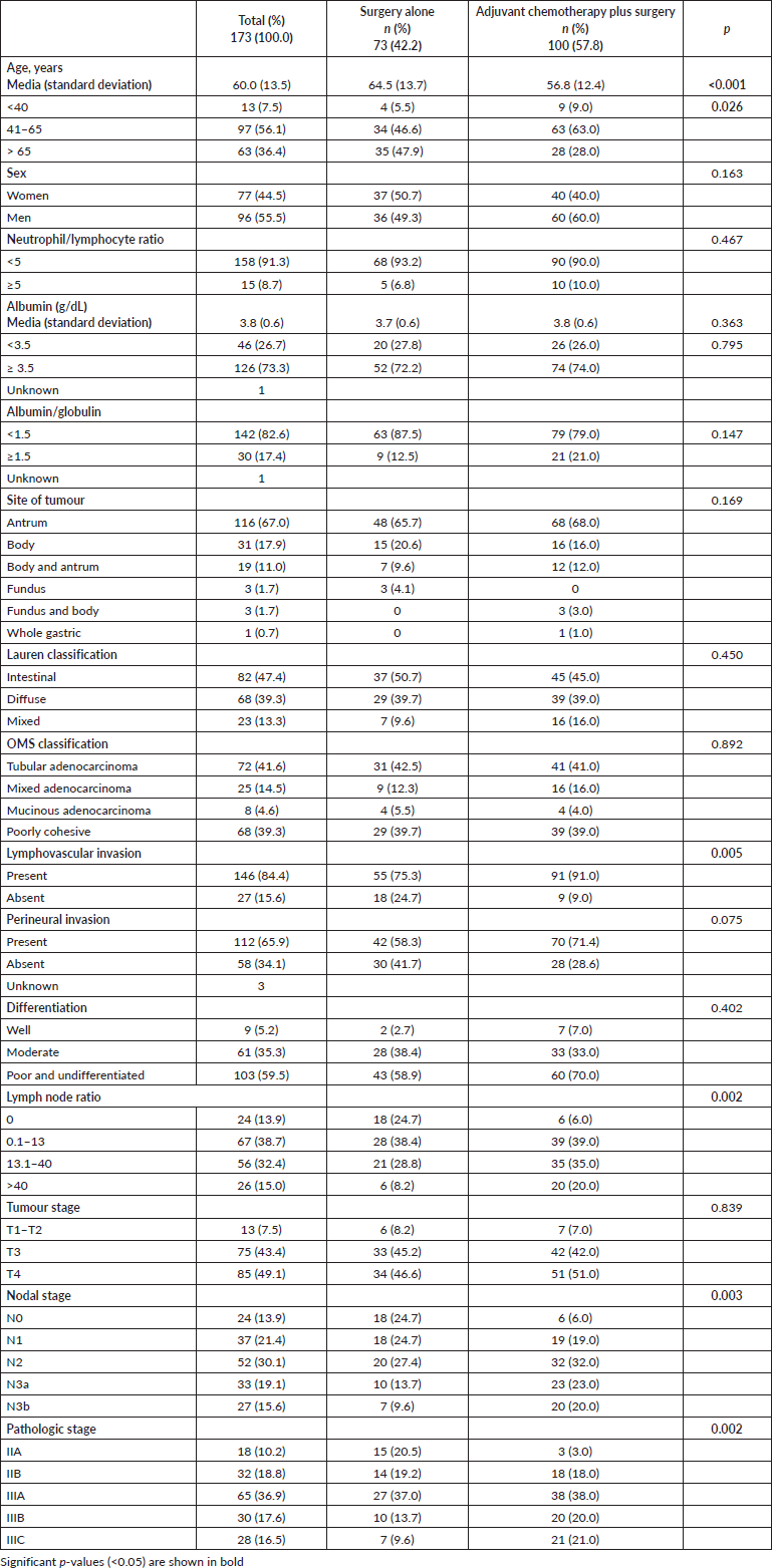 Between January 2014 and December 2016, 2,817 patients with GC were registered at INEN. Of these, 1,541 (54.7%) had clinical stage II–III. From them, 1,325 were excluded according to the exclusion criteria described above. In total, 173 gastric cancer patients with stage II–III who underwent radical gastrectomy and D2 dissection were included in this study: 100 (57.8%) patients received adjuvant chemotherapy and surgery and 73 (42.2%) surgery alone. Table 1 shows demographics and clinical characteristics according to type of treatment.