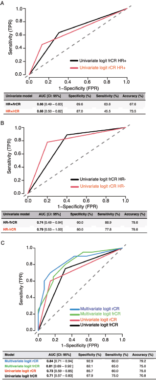 Figure 1. Diagnostic accuracy of CEM by HR status and ROC curves in univariate and multivariate models. (a) Diagnostic accuracy in HR+ tumours. (b) Diagnostic accuracy in HR− tumours. (c) ROC curves. Abbreviations: TPR: true positive rate, FPR: false positive rate, HR: hormone receptor, Logit: logistic regression, AUC: area under the curve, frCR: functional radiological complete response and rCR: radiologic complete response.