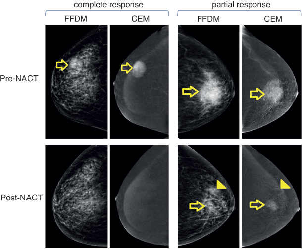 Figure 2. Examples of patients with complete or partial response to NACT. Left panels show images of a 51-year-old female patient with right breast invasive ductal carcinoma with a complete response to NACT. Upper and lower panels show pre-NACT and post-NACT images, respectively. Right panels show images of a 60-year-old female patient with left breast invasive ductal carcinoma with residual disease (partial response) after NACT. Abbreviations: FFDM: full-field digital mammography, CEM: contrast-enhanced mammography; and NACT: neoadjuvant chemotherapy.
