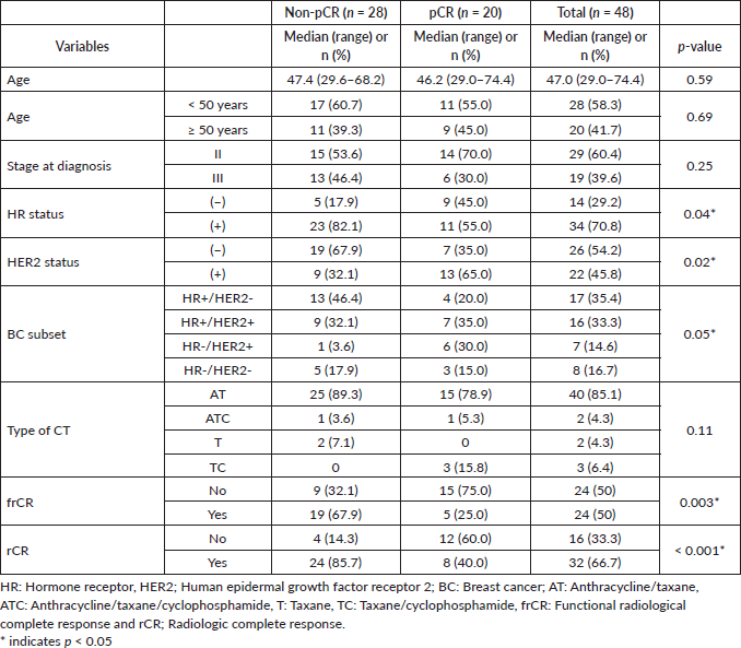 Results: A total of 48 patients were included in our study. Most patients (68.7%) were hormone receptor (HR)+ and 41.6% (20) of the patients achieved pCR. Using univariate logistic regression analyses we found that HR status, HER2 status, rCR and frCR had a significant impact on CEM diagnostic accuracy. Exploratory analyses found that CEM sensitivity was higher for HR− tumours. Multivariate logistic regression analyses found 60% sensitivity, 92.9% specificity and 79.2% accuracy in a model that included clinical variables and rCR.