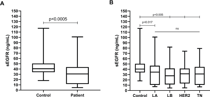 Figure 1. Boxplot representing the peripheral blood serum EGFR (sEGFR) levels (ng/mL) in (a): healthy volunteers (n = 89) versus breast cancer patients (n = 206) and (b): healthy volunteers versus breast cancer patients (n = 206), according to IH subtype (LA, Luminal A; LB, Luminal B; HER2, HER2/ERBB2 overpexression/amplification; TN, triple-negative).