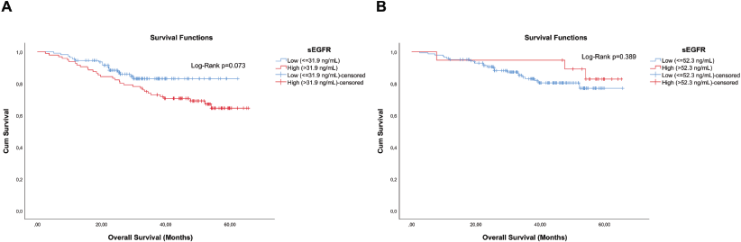 Figure 2. Cumulative survival curves by the KM estimator according to sEGFR levels. (a): Overall survival in the entire cohort (n = 206) and (b): non-TN breast cancer patients (n = 162). Each group was submitted to analysis for establishing the optimal sEGFR level cutoff with prognostic value. Lower sEGFR levels were marginally associated with increased overall survival (blue curve), compared to those with higher levels (red curve), but only in the entire cohort including TN breast cancer patients.