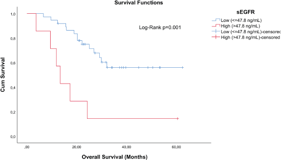 Figure 3. Cumulative survival curves by the KM estimator according to sEGFR levels in TN patients (n = 44). Lower sEGFR levels were associated with increased overall survival (blue curve), compared to those with higher levels (red curve).
