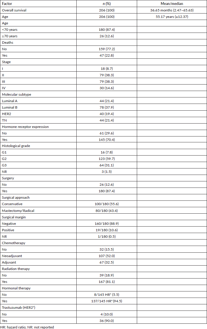 This study included 206 patients with breast carcinoma and 89 healthy age-matched women. In a median follow-up period of 36.6 months, 47 deaths occurred. Twenty-six patients were not operated on, 20 for being metastatic and 6 due to early death, high surgical risk or progression during neoadjuvant chemotherapy. The results are reported according to the guidelines established by Strengthening the Reporting of Observational Studies in Epidemiology. Other clinical and therapeutic characteristics are shown in Table 1.