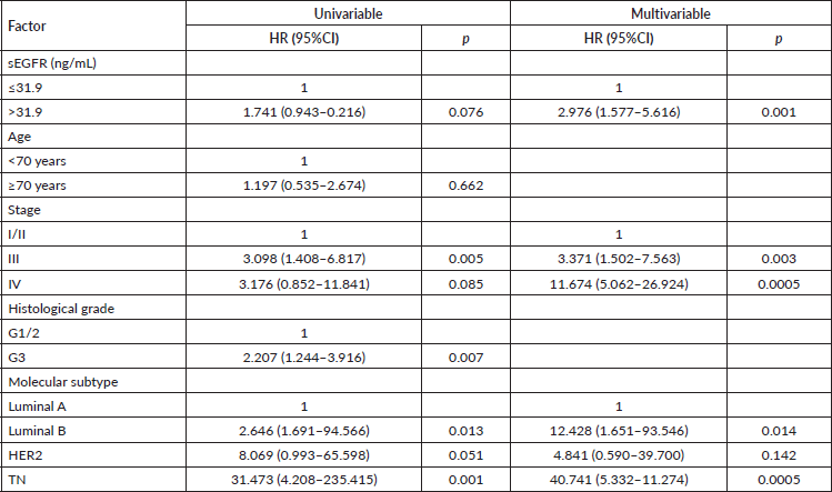 Results: With a median follow-up of 36.6 months, 47 deaths occurred. Multivariable Cox regression showed difference of overall survival (OS) associated with sEGFR levels (sEGFR ≤ or > 47.8 ng/mL) in patients with TN cancers, but not of Luminal A, Luminal B or HER2+ subtypes; adjusted by stage, the death risk increased by approximately 415% [hazard ratio (HR): 5.149 (1.900–13.955), p = 0.001] for patients with sEGFR > 47.8 ng/mL compared to patients with a lower sEGFR value. There was no significant correlation of sEGFR with staging, histological tumour grade (G1/G2/G3), Ki67 (< or ≥14%) or body mass index.