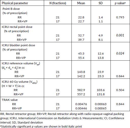 A total of 17 women received two fractions of 9 Gy each, four women received three fractions of 7 Gy each, one woman received four fractions of 7 Gy each and two received two fractions of 9.5 Gy each. This amounted to 54 HDR ICB sessions in this cohort of 24 patients. Nine ICB sessions delivered using T&O applicators were excluded. A total of 45 ICB sessions were delivered using T&R applicators. Seven fractions out of 45 were not eligible for analysis because of the following reasons: the prescribed dose was too low in two treatment plans; suboptimal applicator placement in two sessions and the standard loading patterns and ICRU-38 recommendations were not followed in three sessions. This left 38 ICB sessions for analysis. Out of these 38 sessions, 21 ICB sessions performed using an RR alone constituted the RR group, and 17 ICB sessions, in which an RR blade was combined with radio-opaque VP, constituted the RR+VP group.