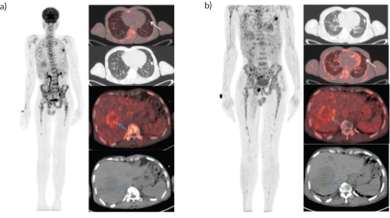 Figure 1. Whole body FDG PET scan. (a): Pretherapy PET/CT shows increased tracer uptake in the thoracic, liver and multiple skeletal regions in maximum intensity projection image (A).Trans-axial fused PET/CT and CT sections shows multiple random distribution parenchymal nodules in the lungs (white arrows) and large necrotic peripheral FDG avid lesion in segment VII/VIII of the liver measuring 5.3 × 5.5 cm .Also noted FDG avid lytic lesions noted in D10 vertebra (blue arrows). (b): Post-therapy PET/CT shows increased tracer uptake in the thoracic, liver and multiple skeletal regions in maximum intensity projection image (A).Trans-axial fused PET/CT and CT sections shows multiple random distribution parenchymal nodules in the lungs(white arrows) and large necrotic peripheral FDG avid lesion in segment VII/VIII of the liver measuring 7.3 × 6.1 cm. Compared to pretherapy PET/CT scan there is increase in size of liver lesions along with increase in number of lung and skeletal lesions suggestive of progressive disease.