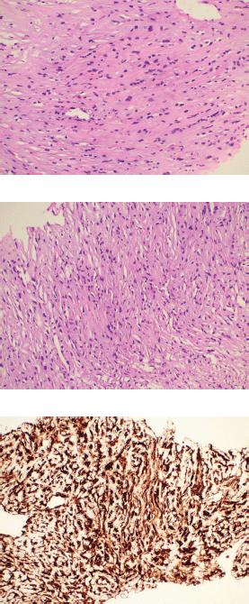 A 46-year-old gentleman, presented with low back ache and difficulty in walking for 3 months, associated with loss of appetite and loss of weight. Other notable points in history include a dragging sensation in the right upper abdomen and difficulty in initiating micturition. Clinical examination revealed tenderness in the right upper quadrant of abdomen, and increased tone and decreased power in the right lower limb, with patient being bedridden with an Eastern Co-operative Oncology Group performance status of 4. A baseline positron emission tomography (PET) scan (Figure 1a) revealed lytic and sclerotic lesions with increased fluoro-deoxy glucose (FDG) uptake in the entire axial and appendicular skeleton, multiple subpleural and parenchymal lung nodules and discrete hypodense lesions in segment 7/8 of liver. Keeping in view the patient age and diffuse lytic lesions in PET scan, a multiple myeloma work up was done, including serum electrophoresis and serum free light chain assay, which were all normal. His liver biopsy and bone marrow biopsy showed a poorly differentiated mesenchymal tumour. Despite multiple reviews with sarcoma pathologists; his diagnosis could not be established. Subsequently liver biopsy was repeated and sent again for expert review, which revealed a collagenising spindle cell proliferation comprised of epithelioid and short spindled cells with ovoid nuclei, fine chromatin, inconspicuous nucleoli and scanty eosinophilic cytoplasm (Figure 2a and b). The tumour cells expressed MUC 4 (Figure 2c), while S-100, SOX10, desmin, smooth muscle antigen, CD34 and ETS-related gene were negative, suggestive of SEF. FUS-CREB3L1 fusion was not available in-house, so EWSR1 gene rearrangement by fluorescence in-situ hybridisation (FISH) was done, which was positive. He was started on systemic chemotherapy subsequently. He had disease progression following two lines of therapy, namely cyclophosphamide-doxorubicin (Figure 1b) and gemcitabine-docetaxel. He was later switched to the oral multi-kinase inhibitor pazopanib, following which he had remarkable improvement in his general condition. This patient who was bedridden before therapy, could walk again and there was notable improvement in his abdominal pain, appetite and weight. But the response was short lived, lasting for 2 months, with subsequent PET scans showing disease progression.