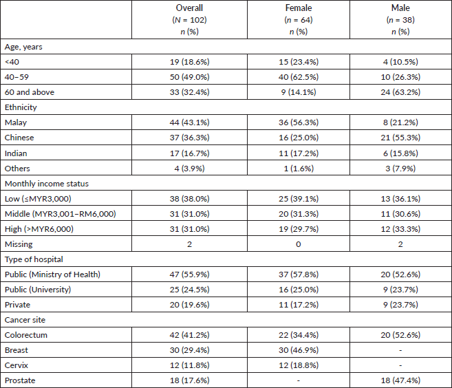 Data saturation was reached after 20 FGDs; 12 FGDs with 64 women, 8 FGDs with 38 men. Majority of the participants were between 40 and 59 years old (49%), of Malay ethnicity (43%) and married (76%) (Table 1). About half hailed from low-income households, and two thirds of study participants were from public hospitals. Approximately 41% of patients had colorectal cancer, 30% with breast cancer, 20% with prostate cancer and 12% with cervical cancer. Median time since cancer diagnosis was 20 months (interquartile range: 11–38 months). Close to 60% of the cancer patients reported that they were diagnosed with advanced stages at initial diagnoses.
