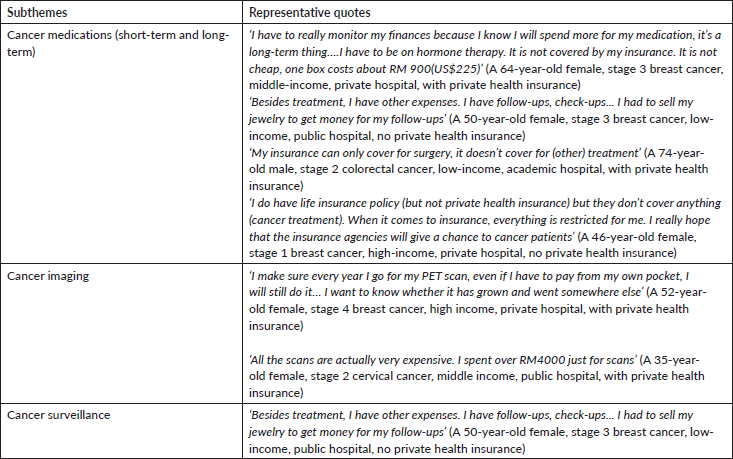 ‘I have to really monitor my finances because I know I will spend more for my medication, it’s a long-term thing…..I have to be on hormone therapy. It is not covered by my (private health) insurance. It is not cheap, one box costs about RM900 (US$225)’ (A 64-year-old female, stage 3 breast cancer, middle-income, private hospital, with private health insurance).