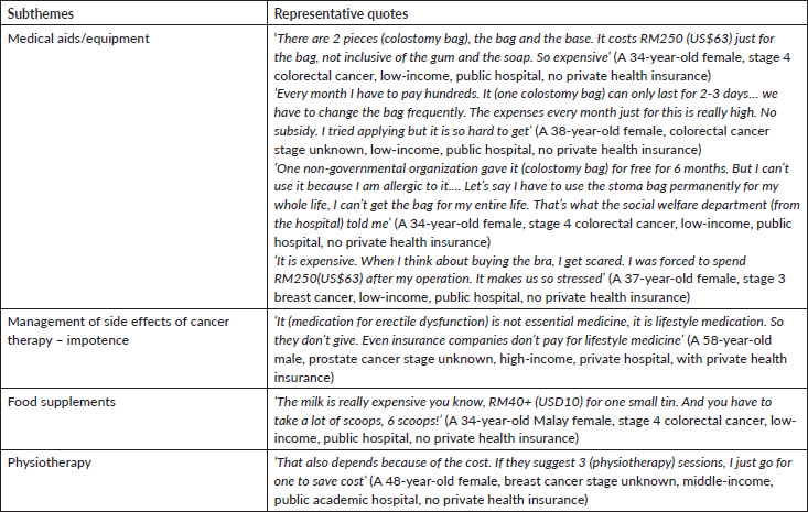 For participants with prostate cancer, their primary financial burden for supportive care was attributed to the need for medication for erectile dysfunction. As it is considered as a ‘lifestyle medication’, it is neither subsidised at the government hospitals nor covered by private health insurance. In many instances, patients reported paying out of pocket for it.