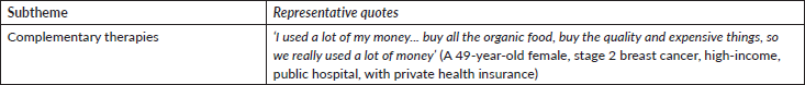 ‘I used a lot of my money... buy all the organic food, buy the quality and expensive things, so we really used a lot of money’ (A 49-year-old female, stage 2 breast cancer, high income, public hospital, with private health insurance).