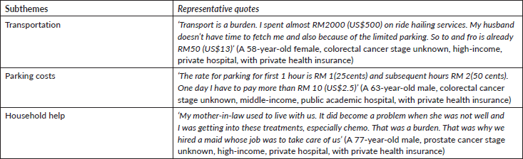 ‘Transport is a burden. I spent almost RM2000 (US$500) on ride hailing services. My husband doesn’t have time to fetch me and also because of the limited parking. So to and fro is already RM50 (US$13)’ (A 58-year-old female, colorectal cancer [stage unknown], high-income, private hospital, with private health insurance).