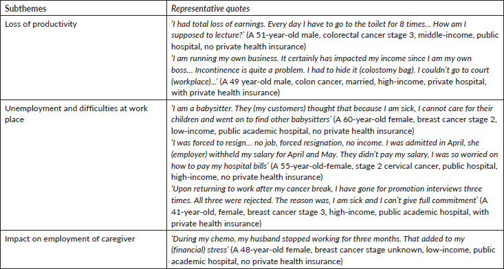 ‘Upon returning to work after my cancer break, I have gone for promotion interviews three times. All three were rejected. The reason was, I am sick and I can’t give full commitment’ (A 41-year-old, female, stage 3 breast cancer, high income, public academic hospital, with private health insurance).