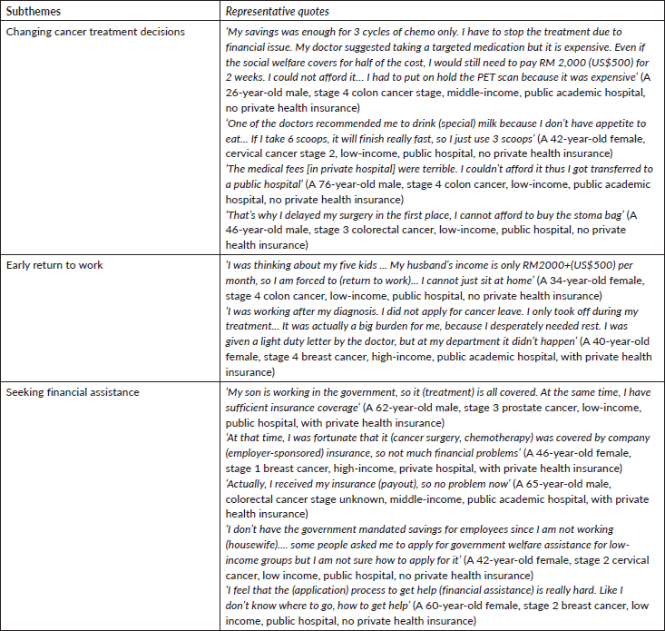 To cope with the financial burden of conventional and supportive care treatment, participants reported making decisions such as either foregoing or discontinuing recommended cancer therapies, opting for cheaper alternatives, consuming less than the recommended dose or transferring from private hospitals to public hospitals. One participant even recounted on how he chose to delay his cancer surgery after considering the costs of the colostomy bags.
