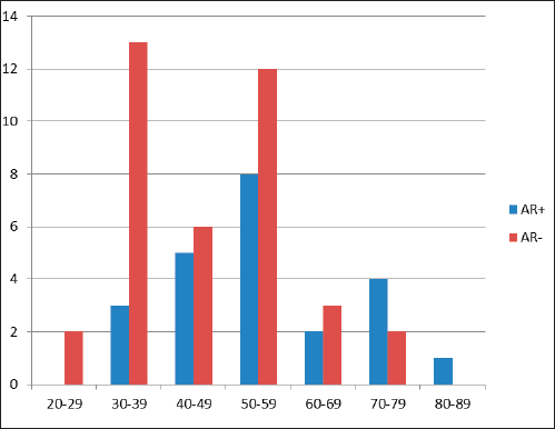 Figure 1. Age (years) distribution in relationship to frequency of AR expression in TNBC showing a bimodal age (years) peak.