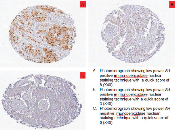 Figure 2. Photomicrographs showing AR expression of TNBCs. (a): Low power AR positive immunoperoxidase nuclear staining technique with a quick score of 8 (×40). (b): Low power AR positive immunoperoxidase nuclear staining technique with a quick score of 3 (×40). (c): Low power AR negative immunoperoxidase nuclear staining technique with a quick score of 0 (×40).