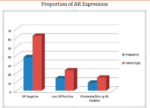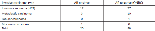 There was no significant association between the expression of AR in TNBC cases and histologic types. Tumour grade was relatively higher among AR negative subjects compared to AR positive subjects, though this was not statistically significant. The predominant histologic type was invasive carcinoma (NST) in both AR positive and AR negative categories. Within the AR positive tumours, invasive carcinoma NST accounted for 19 of 23 cases (82.6%), metaplastic carcinoma accounted for 3 of 23 cases (13.0%) and invasive mucinous carcinoma for 1 of 23 cases (4.4%). Amongst the TNBC that were AR negative, invasive carcinoma NST accounted for 27of 38 cases (71.1%), metaplastic carcinoma 10 of 38 cases (26.3%) and invasive lobular carcinoma 1of 38 cases (2.6%).