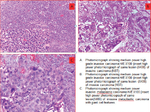 Figure 4. Photomicrographs showing morphologic phenotypes in TNBCs. (a): Medium power high grade invasive carcinoma H/E×100 (insert high power photomicrograph of same lesion (×400) of invasive carcinoma (NST)). (b): Medium power high grade invasive carcinoma H/E×100 (insert high power photomicrograph of same lesion (×400) of invasive carcinoma (NST)). (c): Medium power invasive metaplastic carcinoma H/E×100 (insert high power photomicrograph of same lesion (×400) of invasive metaplastic carcinoma with giant cell features).