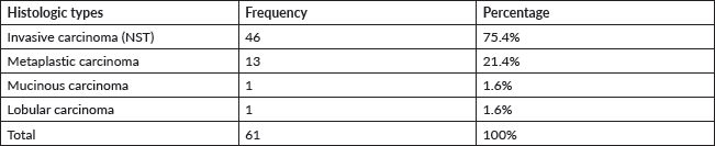 The predominant histologic types were invasive carcinoma, no special type (NST), 46 of 61 (75.4%) and metaplastic carcinoma 13 of 61 (21.4%). One case each of invasive lobular carcinoma and invasive mucinous carcinoma 1 of 61 (1.6%) was seen (Table 1). While there was no grade 1 invasive breast cancer, there were 29 (47.5%) grade 2 and 32 (52.5%) grade 3 invasive breast cancers. Using the components of histological grading (nuclear pleomorphism, tubule formation, mitoses), most grade 2 cancers had Elston Ellis modification of the Scarff_Bloom Richardson grading system (ESBR) score of 7 (26 of 29) with a minority scoring 6 (3 of 29) [32]. Amongst the grade 3 invasive breast cancers, more than half had ESBR score of 8 (18 of 32) while the rest had ESBR score of 9 (14 of 32).