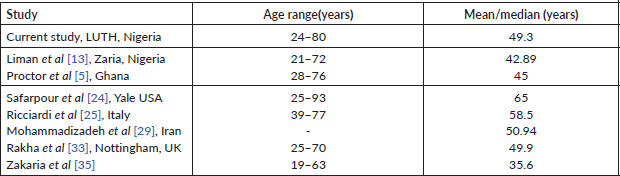 The mean age for index study is 49.3years and the mean for Zaria TNBC study population is 42.89 ± 11.88 years which falls under 50 years of age and is similar to median ages of under 50 years reported by Ghanaian (45 years), Egyptian (35.6 years) and Nottingham (49.9 years) study cohorts, respectively [5, 13, 33, 35]. However, the median ages for Yale based study in the USA (65 years), an Italian cohort (58.8 years) and mean age for Iranian population (50.94 years) were all over 50 years [24, 25, 29]. Other studies also corroborate the younger age of incidence as well as the poor prognosis of TNBC in Africans and African-Americans when compared to Caucasians. The mean/median ages for the African and Caucasian studies are highlighted in Table 2.