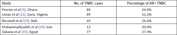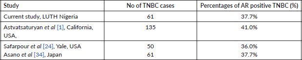 The Zaria study reported 11.2% of the 89 TNBCs expressed AR positivity [13]. A comparatively high value was reported in Iran where 6/12 (50%) of the TNBC were AR negative [29]. Coincidentally, a similar study of a Japanese TNBC cohort reported that 23 of 61 (37.7%) and 38 of 61 (62.3%) were AR positive and AR negative, respectively [34]. These authors used the same cut off value of 1% for positivity. Ricciardi et al [25] investigated 45 Italian TNBC cohorts and reported 26.6% as AR positive and 73.3% QNBC cases. Overall these studies recorded significant number of cases expressing AR (See Tables 4 and 5).