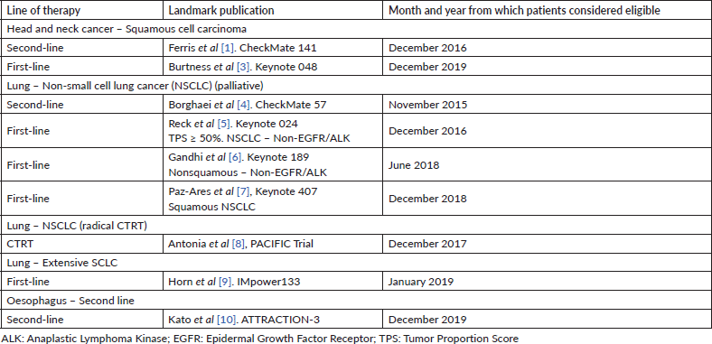 4. Patients for particular indications were considered eligible for immunotherapy from 1 month after the first publication of any positive checkpoint inhibitor data in abstract presentations or peer-reviewed journals. The table used for the identification of the patient pool is shown in Table 1.