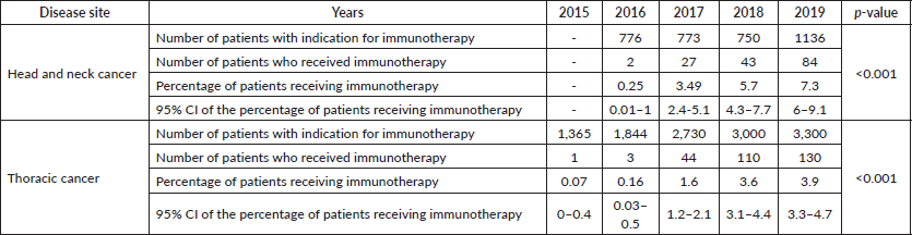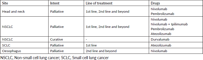 Methods: All patients who were registered in the head and neck and thoracic medical oncology unit between 2015 and 2019 were included in the study. Patients who received immunotherapy were identified from the prospective database of immunotherapy maintained by the department. We made a list of patients who were eligible for immunotherapy per year and identified how many of them received recommended immunotherapy. The indication for eligibility of immunotherapy was based on published pivotal data and it was applicable from the date of publication of the study online. Descriptive statistics were performed. For nominal and ordinal variable percentage with 95% confidence intervals (95% CI) was provided. Factors impacting the accessibility of immunotherapy were identified.