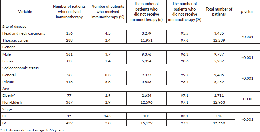 Findings: A total of 15,674 patients were identified who required immunotherapy; out of them only 444 (2.83%, 95% CI: 2.58–3.1) received it. Among head and neck cancer patients, 4.5% (156 out of 3,435) received immunotherapy versus 2.35% (288 out of 12,239) among thoracic cancer patients (p < 0.001). Among the general category (low socioeconomic), 0.29% (28 out of 9,405 ) versus 6.6% (416 out of 6,269) among the private category (high socioeconomic) received immunotherapy (p < 0.001). While 3.7% (361 out of 9,737) among males versus 1.39% (83 out of 5,937) females received immunotherapy (p < 0.001). There was also a temporal trend seen in the accessibility of immunotherapy (p < 0.001).