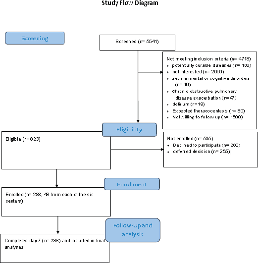 Between May 1, 2019, and April 30, 2020, 5,541 patients were screened for eligibility. Two hundred and eighty-eight (35%) of 823 eligible patients were enrolled (48 patients from each of the six centres) (See Figure 1).