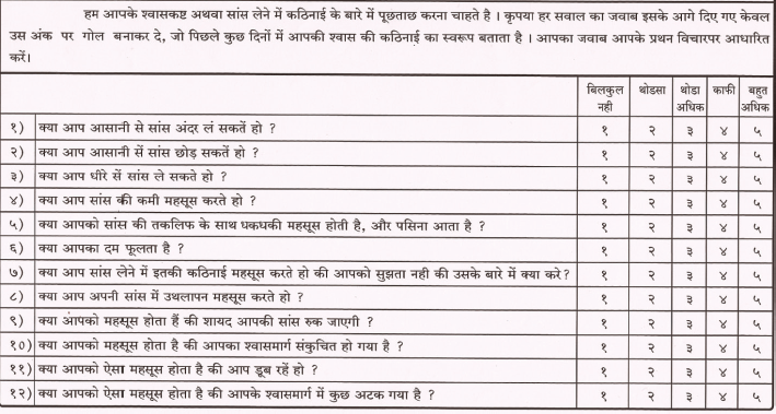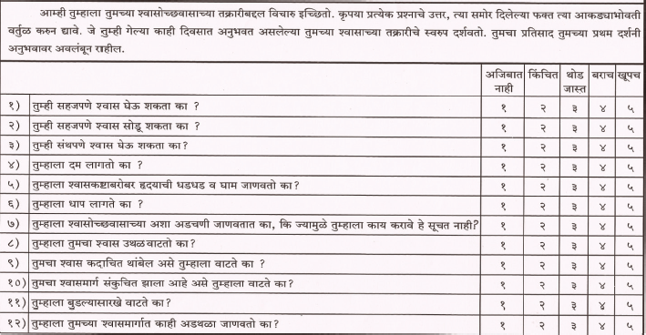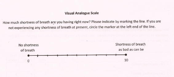 It is a 10 cm uncalibrated horizontal line and has been translated and validated in Hindi and Marathi. The left end of the line is labeled “I Can Breathe as I Normally Do” and the right end of the line is labeled “I Can’t Breathe at all”. The patient’s mark was then converted to a score by measuring the distance from the left end of the line to the nearest 1 mm. Therefore, a dyspnea VAS score of 0 corresponds to the patient’s subjective feeling of “I Can Breathe Normally” and a dyspnea VAS score of 100 corresponds to “I Can’t Breathe at all.”