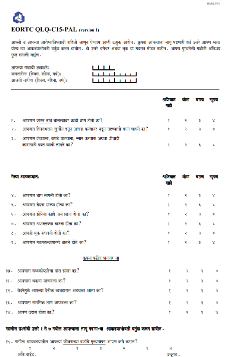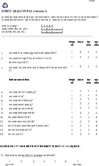 EORTC C-15 PAL is a tool developed to measure the quality of life in cancer patients in a palliative care setting and has been translated and validated in Hindi and Marathi. It consists of 15 questions, which are transformed into two function scales (‘Physical Functioning’, ‘Emotional Functioning’), seven symptom scales (‘Fatigue’, ‘Nausea/Vomiting’, ‘Pain’, ‘Dyspnea’, ‘Insomnia’, ‘Appetite loss’, ‘Constipation’) and an ‘Overall quality of life’ scale. Patients should answer the questions according to their experiences during the previous week. Responses to 14 questions are given on a four-point Likert scale with 1 ‘Not at all’, 2 ‘A little’, 3 ‘Quite a bit’, and 4 ‘Very much’, the question to overall QoL allows answers between 1 ‘Very poor’ and 7 ‘Excellent’.