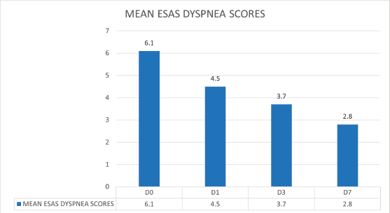 Figure 4. The mean dyspnoea scores on ESAS showing a downward trend from 6.1 on day 0 to 2.8 on day 7 post opioids and standard palliative care intervention.
