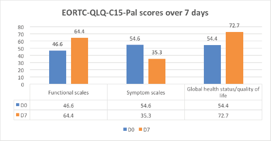 Figure 6. EORTC-QLQ-C15-PAL scores on day 0 and day 7, showing improvement in functional scores and global health status and a reduction in symptom scales.