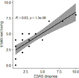 A correlation between ESAS scores of dyspnoea and the feeling of well-being after the use of morphine (n = 22) (where 10 signifies Worst Possible Wellbeing) suggests a positive Pearson correlation coefficient of 0.83, p value of <0.001.